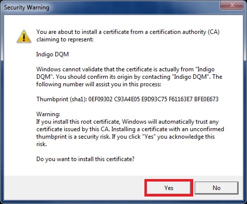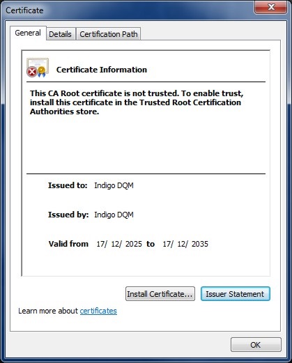 The Indigo DQM CA root certificate needs to be installed