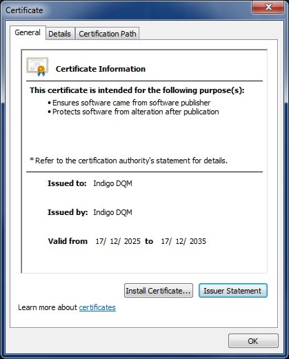 Indigo DQM code signing certificate in the trusted root