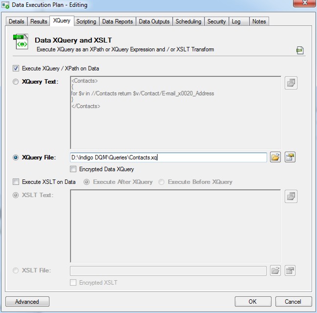 Indigo DQM's Data Management Engine (DME) can execute additional XQuery expressions and / or XSLT transforms on Data Execution Plans if required.