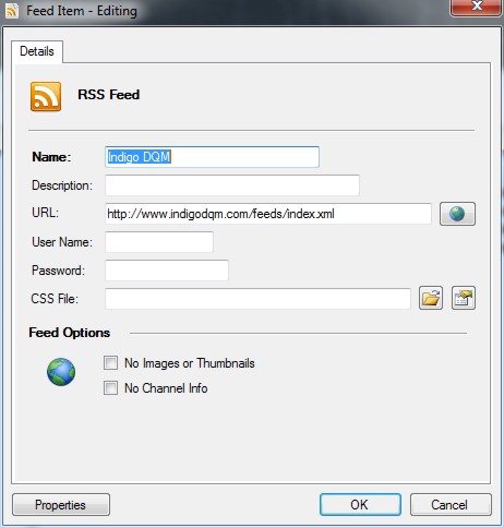 Indigo DQM RSS news aggregator will automatically check RSS Feeds for new content and display the output. Feeds can be organised into Folders to categorise Feed content.