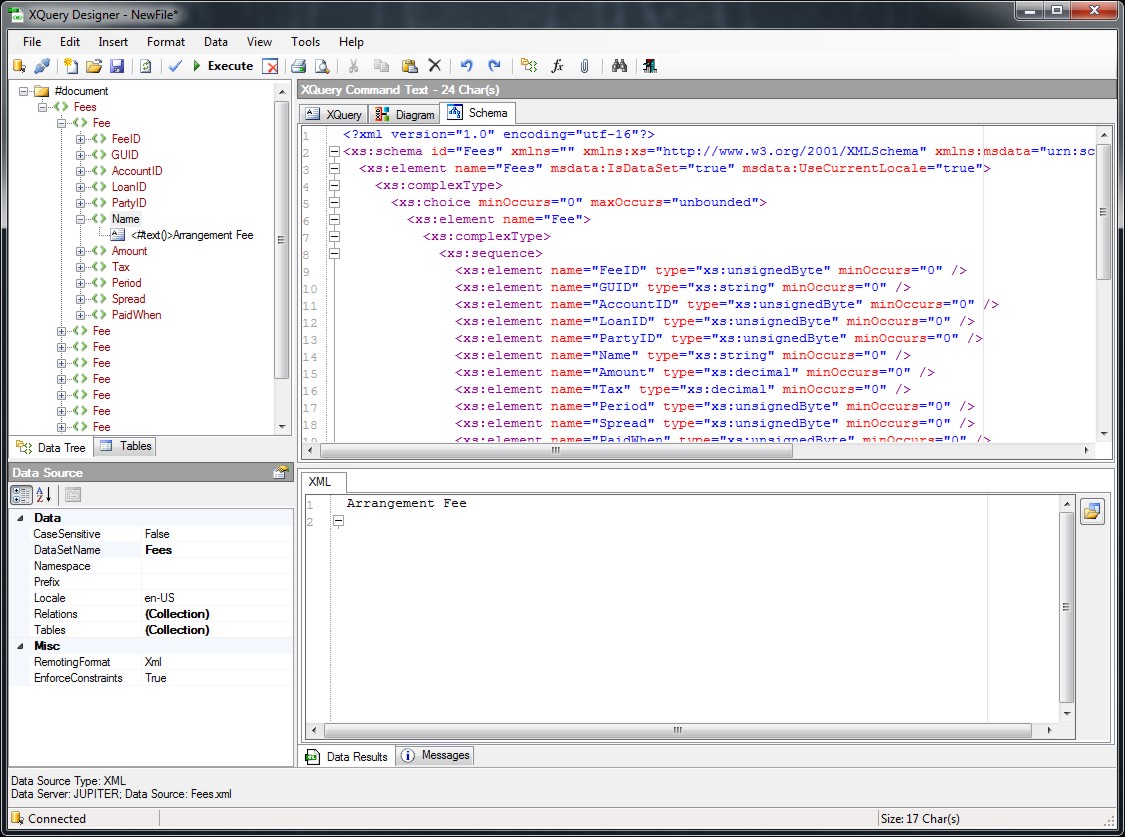 The XQuery Designer shows a logical view of the XML Data in a tree-view and the XQuery Commands provides the means to extract and manipulate Data.