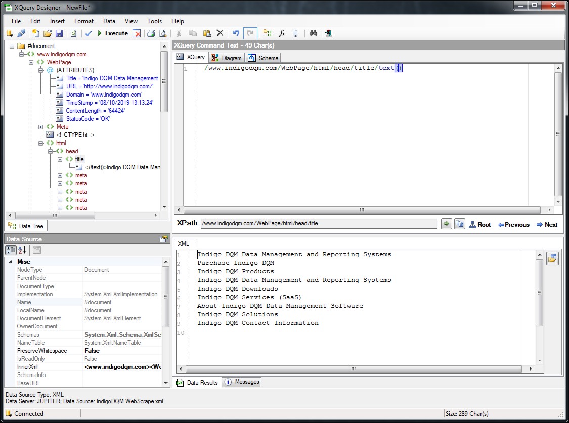 Indigo DQM XQuery Designer allows complex XQueries and XPath statements to be executed against a Data Source. XQuery is a query and functional programming language that is designed to query and transform collections of structured and unstructured Data, usually in the form of XML (Extensible Markup Language).
